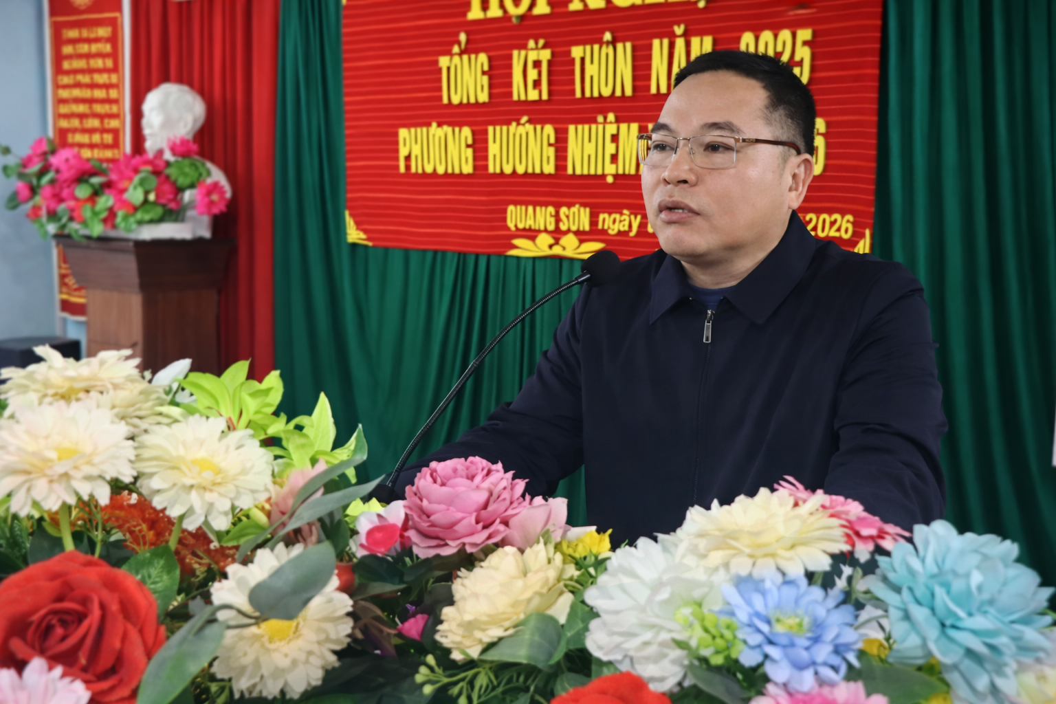 Phát biểu tại hội nghị, Lãnh đạo HĐND, UBND xã ghi nhận và biểu dương những kết quả mà thôn Quang Sơn đã đạt được trong năm 2025, nhất là trong phát triển kinh tế, giữ vững an ninh trật tự, phát huy tinh thần đoàn kết của Nhân dân. Đồng chí đề nghị thời gian tới, thôn tiếp tục bám sát nghị quyết của cấp ủy, tập trung khai thác hiệu quả tiềm năng, thế mạnh về trồng chè, chăn nuôi, lâm nghiệp; làm tốt công tác giảm nghèo bền vững, xây dựng đời sống văn hóa ở khu dân cư, giữ gìn bản sắc văn hóa dân tộc gắn với xây dựng nông thôn mới. Tăng cường tuyên truyền, vận động Nhân dân chuyển đổi cơ cấu cây trồng, vật nuôi theo hướng hiệu quả; chủ động phòng, chống dịch bệnh trên cây trồng, vật nuôi; tiếp tục huy động Nhân dân hiến đất, góp công làm đường giao thông nông thôn. Đồng chí cũng yêu cầu thôn duy trì nghiêm công tác quốc phòng - an ninh, quản lý tốt đất đai, tài nguyên, bảo vệ rừng và thực hiện đầy đủ các khoản thu theo quy định.